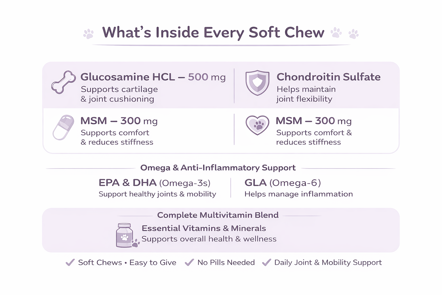 Formulated with Glucosamine, Chondroitin, MSM, and essential vitamins, these soft chews help reduce inflammation, support joint flexibility, and improve overall wellness — all in a tasty beef flavor dogs love.