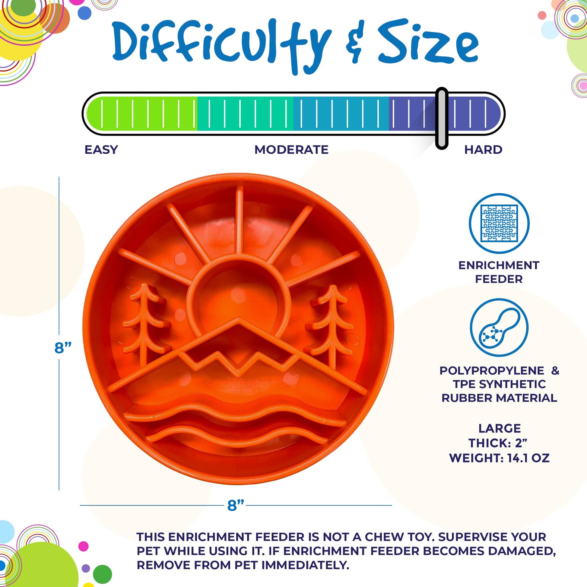 The SodaPup Great Outdoors Design eBowl is an enrichment slow feeder dog bowl designed to transform mealtime into an engaging adventure. Made from premium FDA-compliant materials in the USA, this innovative feeding bowl features a beautiful outdoor-inspired pattern with mountains, sun, and nature elements with raised ridges that slow eating, improve digestion, and provide mental stimulation for dogs of all sizes and breeds.
